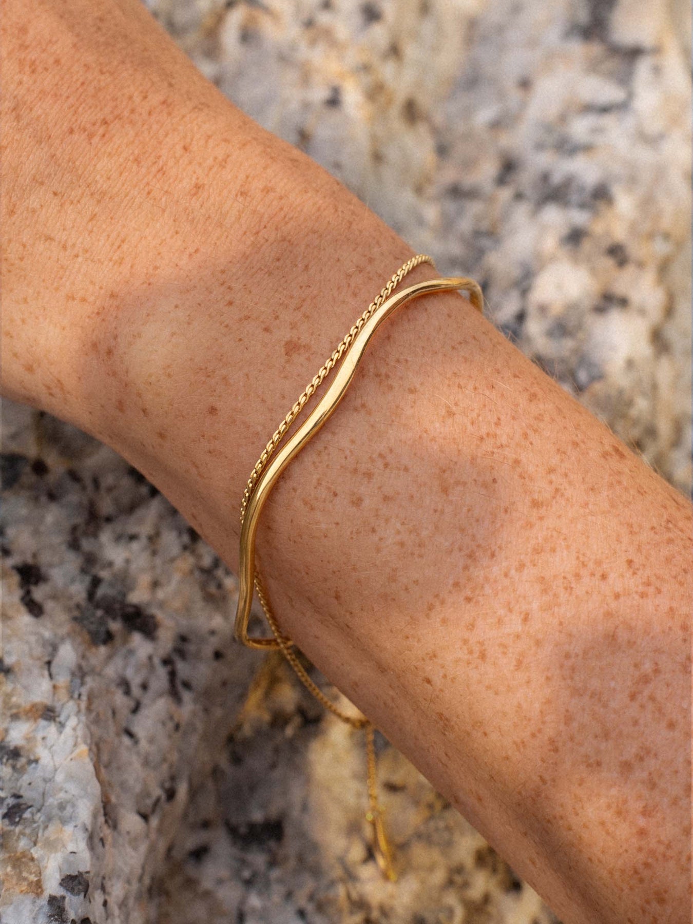 A gold cuff and a gold chain bracelet on a wrist against a textured stone background