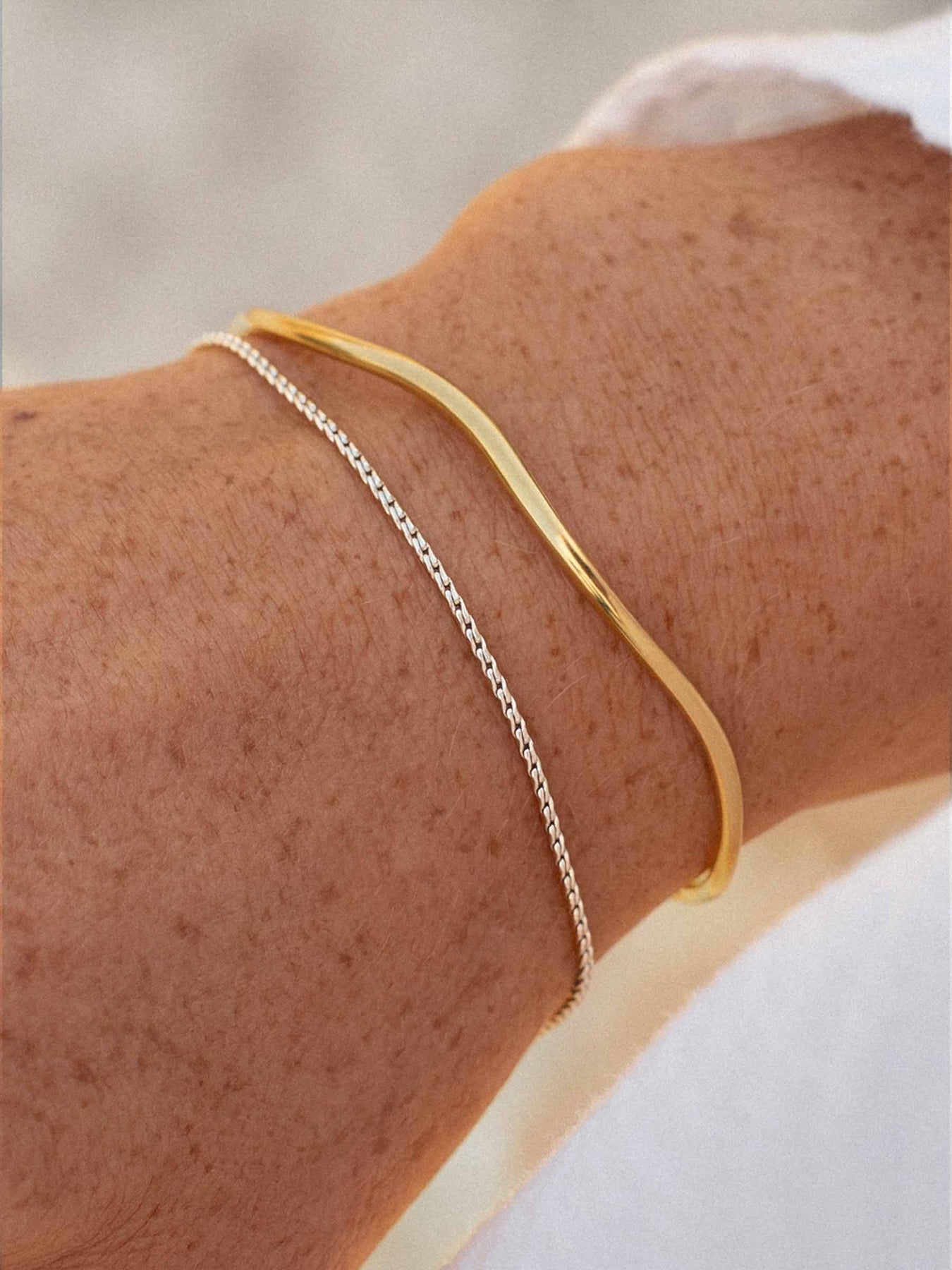 A gold cuff and a silver hain bracelet on a person'e wrist against a light blurred background